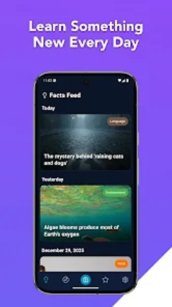Facts a Day - Daily Trivia là một ứng dụng giáo dục được thiết kế cho người dùng Android, cung cấp một nguồn thông tin hàng ngày về những sự thật thú vị trong nhiều lĩnh vực khác nhau như khoa học, lịch sử và thiên nhiên. Mỗi sự thật được trình bày với hình ảnh đẹp, nâng cao trải nghiệm học tập. Người dùng có thể cá nhân hóa việc học của mình bằng cách chọn các chủ đề ưa thích, đảm bảo nội dung vẫn phù hợp và hấp dẫn. Ứng dụng khuyến khích việc ghi nhớ kiến thức thông qua các trò chơi trivia tương tác, cho phép người dùng kiểm tra sự hiểu biết của mình một cách vui vẻ và năng động.